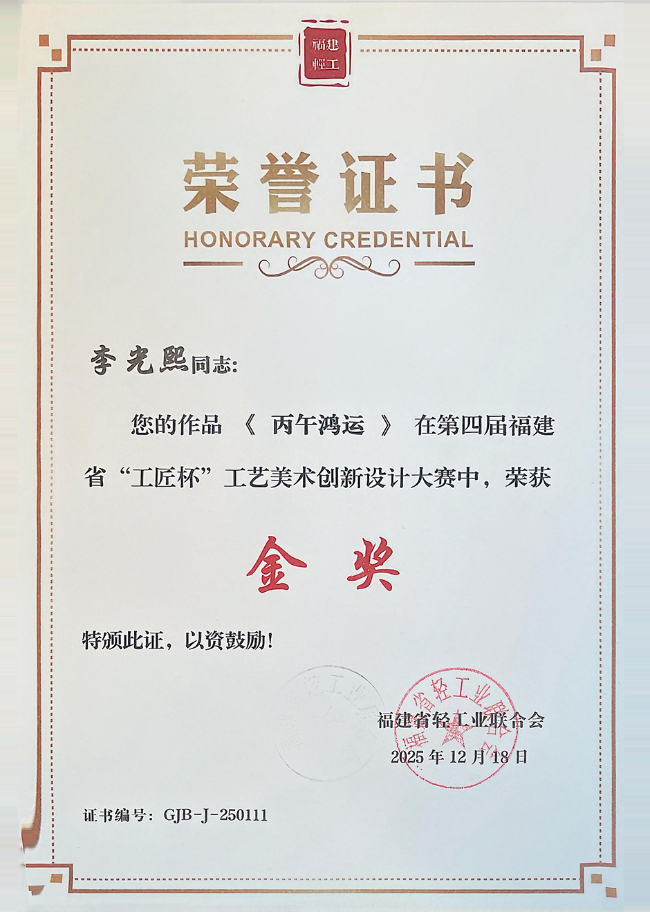 2025.12-作品《丙午鸿运》在第四届福建省"工匠杯"工艺美术创新设计大赛中,荣获“金奖”。