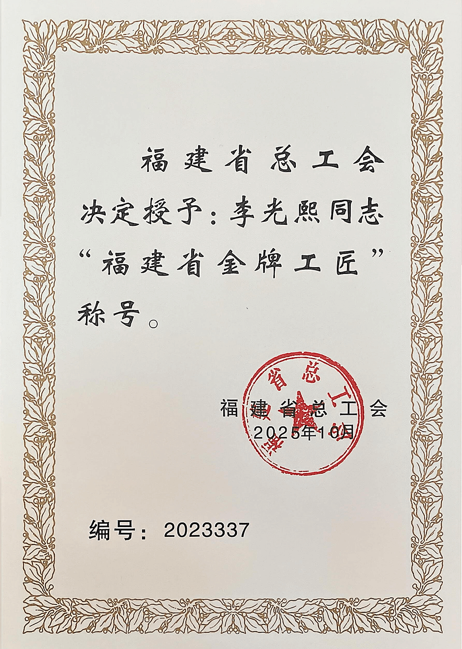 2025福建省总工会决定授予:李光熙同志"福建省金牌工匠"称号。