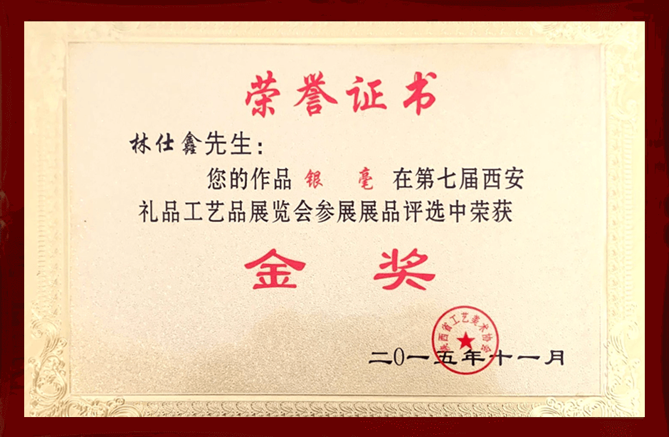 2015年11月-作品《银毫》在第七届西安工艺美术收藏展览会荣获金奖;