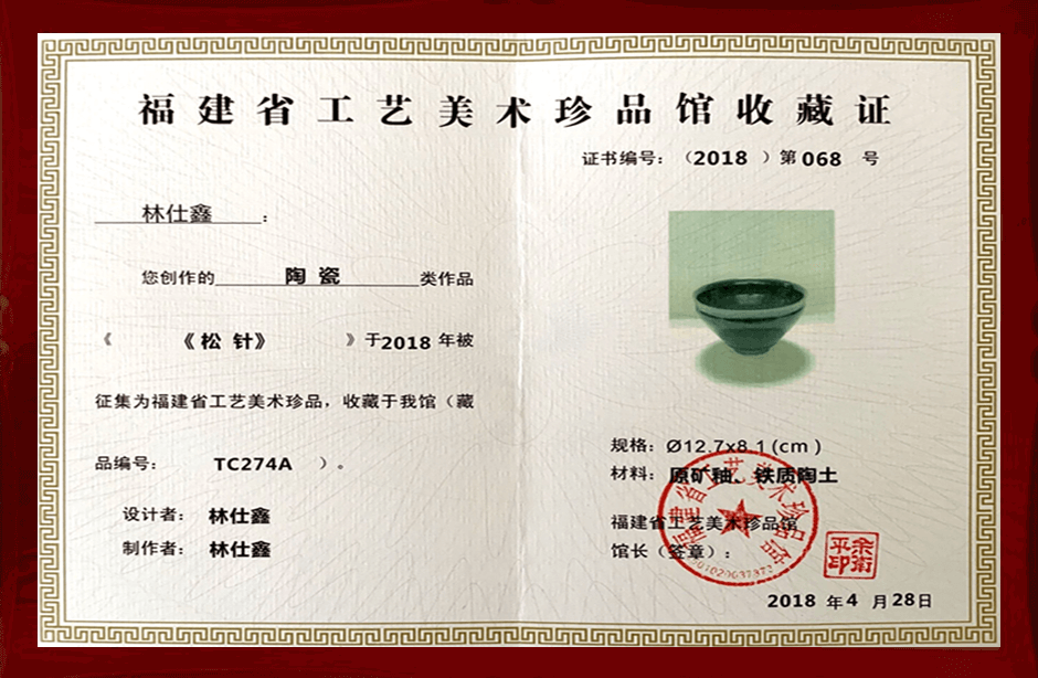 2018年4月-作品《松针》被征集为福建省工艺美术珍品,收藏于福建省工艺美术珍品馆;