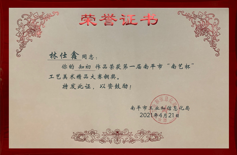 2021年4月-作品《知初》荣获第一届南平市“南艺杯”工艺精品大赛铜奖;